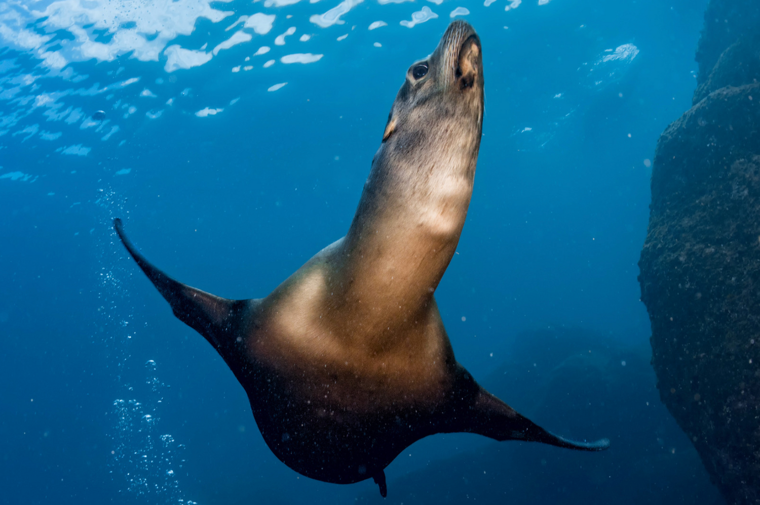 The Galápagos sea lion is a curious and acrobatic marine mammal that’s impossible to miss. Found lounging on beaches, piers, and even benches, they are just as playful underwater.